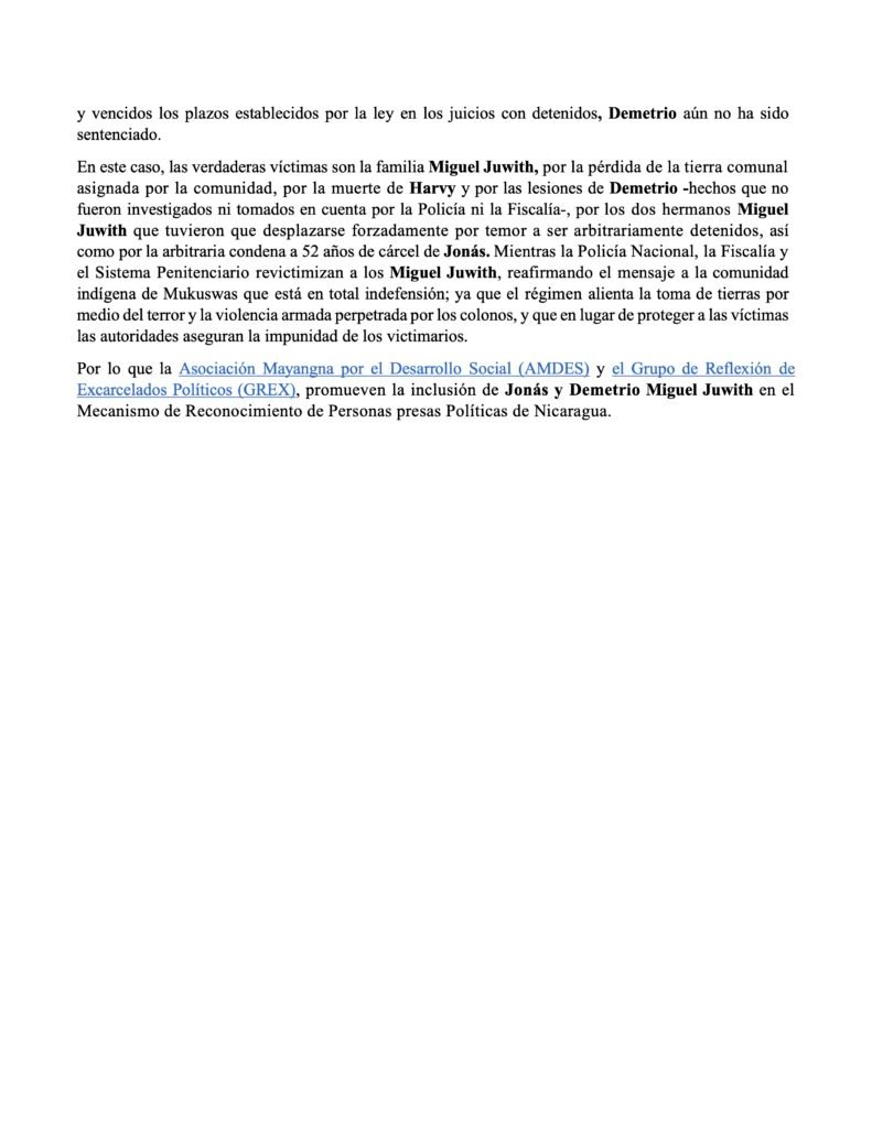 La Asociación Mayangna por el Desarrollo Social (AMDES) y el Grupo de Reflexión de Excarcelados Políticos (GREX) solicitaron la inclusión de Jonás y Demetrio Miguel Juwith en el Mecanismo de Reconocimiento de Personas Presas Políticas de Nicaragua.