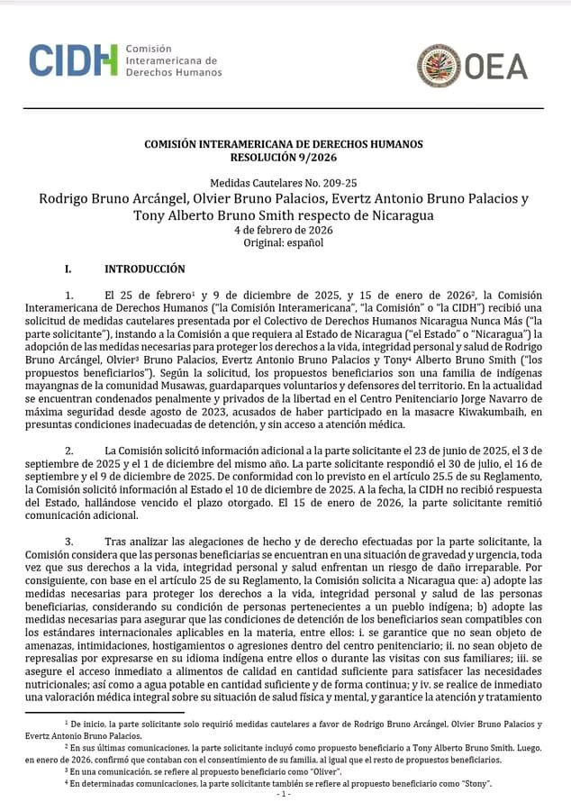 La Comisión Interamericana de Derechos Humanos (CIDH) emitió el pasado 4 de febrero de 2026 la Resolución 9/2026, mediante la cual otorga medidas cautelares a favor de cuatro integrantes de la familia Bruno, defensores del territorio indígena mayangna en Nicaragua. Los beneficiarios, identificados como Rodrigo Bruno Arcángel, Olvier Bruno Palacios, Evertz Antonio Bruno Palacios y Tony Alberto Bruno Smith, se encuentran actualmente privados de libertad en condiciones que la Comisión califica como de “gravedad y urgencia”.